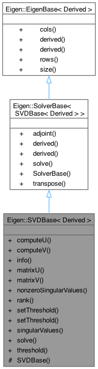 Inheritance diagram for Eigen::SVDBase< Derived >:Public Member Functions | |