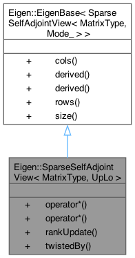 Inheritance diagram for Eigen::SparseSelfAdjointView< MatrixType, UpLo >:Public Member Functions | |